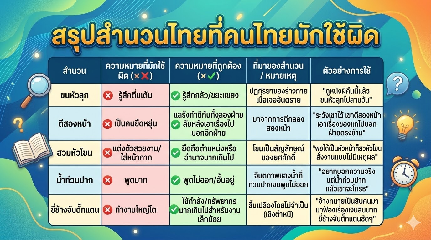 คุณเคยพูดว่า "ขนหัวลุก" แล้วหมายความว่าตื่นเต้น? หรือใช้ "ตีสองหน้า" เพื่อบอกว่าคนใจดีกับทุกคน? ถ้าใช่ — คุณไม่ได้อยู่คนเดียวครับ