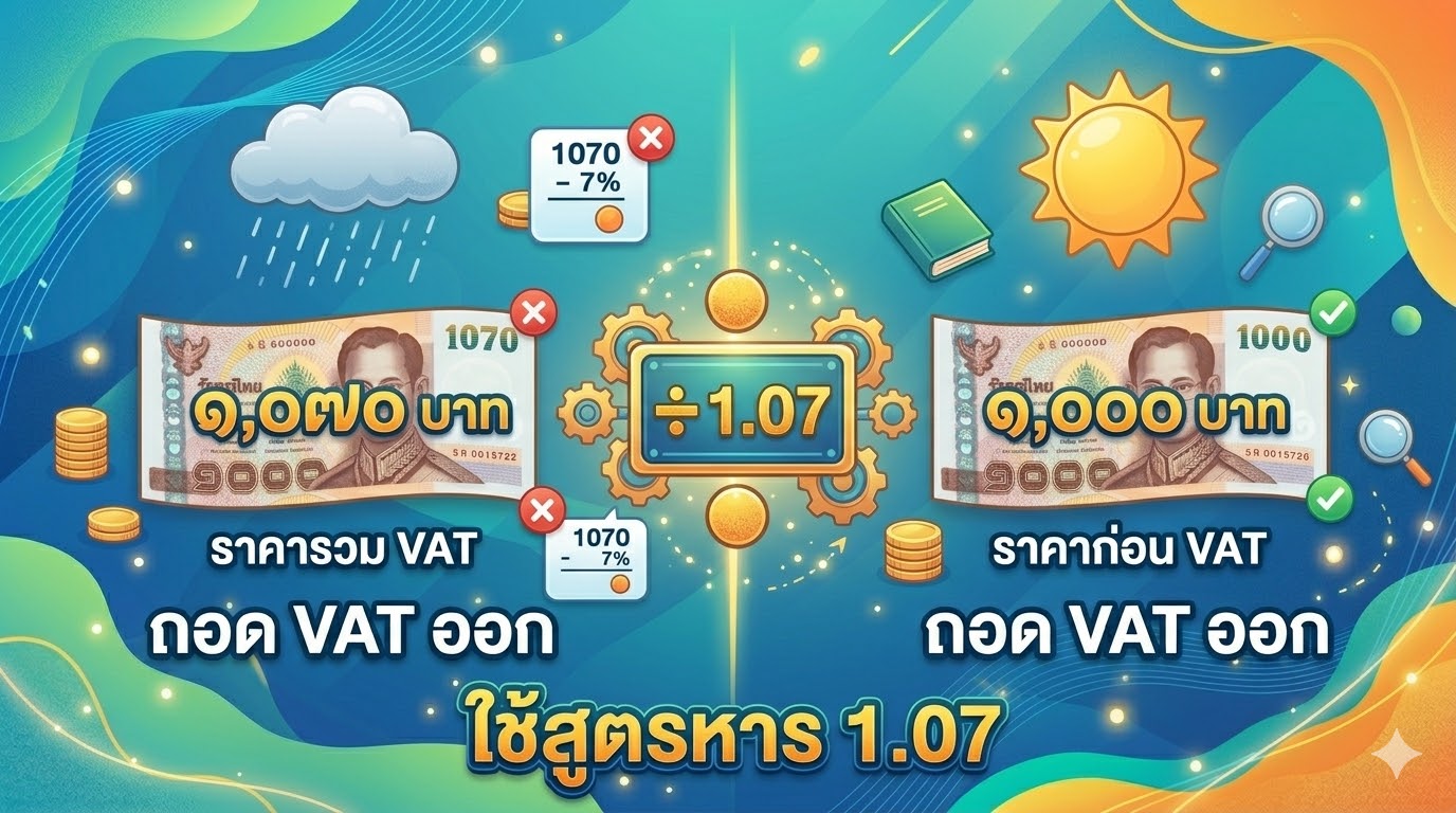 | ถอด VAT | ราคารวม VAT ÷ 1.07 | 1,070 ÷ 1.07 = 1,000 บาท |